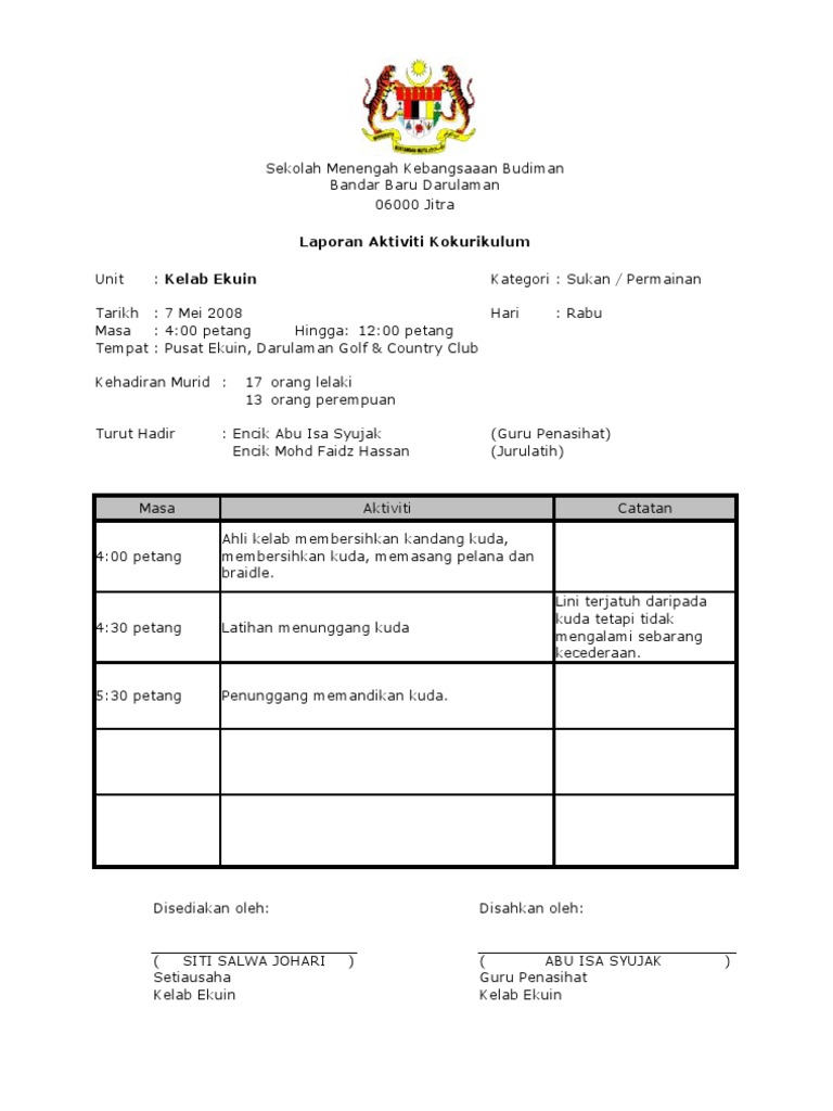 Jawatankuasa nama pengerusi jackie wong naib pengerusi look soon fong, pauline wong setiausaha sia shze ni, andy ting sing ee bendahari alvin. Contoh format laporan aktiviti laporan aktiviti universiti kebangsaan malaysia 10 butiran aktiviti a nama aktiviti. 13 borang kehadiran dan penilaian bagi kegiatan kokurikulum. Kurikulum tersebut juga belum dilengkapi dengan berbagai perangkat pendukung pembelajaran seperti silabus rencana pelaksanaan pembelajaran rpp bahan ajar sistem penilaian dan sejenisnya. Sehingga berikut merupakan beberapa contoh mengenai laporan pkl diberbagai kalangan atau jurusan Laporan aktiviti sukan dan permainan. 1.3 menceritakan secara ringkas keseluruhan aktiviti tersebut dijalankan. *perkara ini wajib disertakan 2. 14 contoh laporan mengiringi pasukan sekolah. Senarai borang yang berkaitan dengan tugas pegawai. Permainan hendaklah menghantar laporan mingguan kepada gpk ko kurikulum pada minggu pertama setiap bulan. Aktiviti ini dapat meningkatkan minat dan penguasaan terhadap permainan catur. Tujuan penyusunan program kerja kurikulum tahun contoh program kepala sekolah cek daftar hadir dan daftar piket berkordinasi dengan wakasek kurikulum.