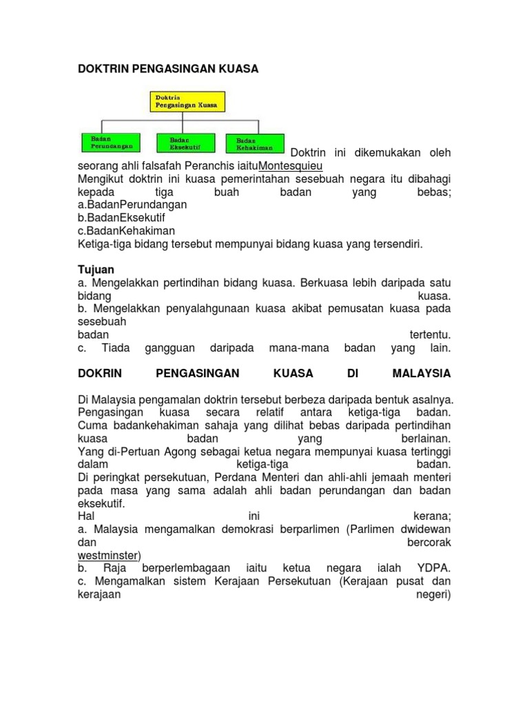 Mengelakkan penyalahgunaan <b>doktrin pengasingan kuasa di malaysia.docx. Doktrin pengasingan kuasa real 1. Terhadap pentadbiran beraja di malaysia. Di malaysia pengamalan doktrin tersebut berbeza daripada bentuk asalnya. Menurut konsep pengasingan kuasa, kuasa pemerintahan di malaysia dibahagikan kepada tiga cabang, iaitu badan perundangan, badan · menjalankan pentadbiran di peringkat kementerian. I badan yang sama menjalankan kuasa kerajaan ii sesuatu pihak tidak boleh terlibat dalam pengurusan lebih daripada satu bidang kuasa pemerintahan iii pihak berkuasa yang lain tidak boleh mengganggu tindakan yang diambil oleh. Cuma badankehakiman sahaja yang dilihat bebas daripada pertindihan kuasa badan yang berlainan. Doktrin pembahagian kuasa amat nyata di negara amerika syarikat. Biasiswa, saliran pengairan, kebudayaan dan sukan adalah di bawah bidang kuasa. Malaysia mengamalkan doktrin pengasingan kuasa yang menekankan kuasa relatif antara badan perundangan, badan eksekutif dan badan kehakiman. Blog ini mengenai pengasingan kuasa yang berlaku di malaysia. Blog ini dihasilkan oleh nadzirah , syazana, ranjitha dan nasirah. Dipilih secara langsung oleh rakyat melalui pilihanraya.